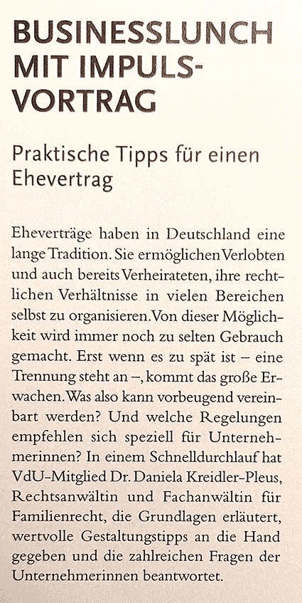Frau Dr. Kreidler-Pleus hat im Rahmen des Business Lunch des VdU Landesverband Württemberg am 20.10.2023 einen Impulsvortrag zum Thema Eheverträge gehalten. Im Schnelldurchlauf wurden die wesentlichen Punkte erläutert und praktische Tipps gegeben.
